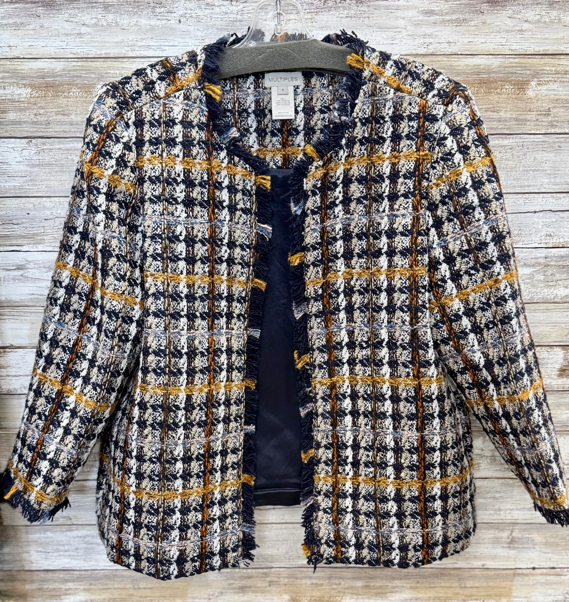 This elegant 3/4 sleeve jacket features an open front design complemented by delicate fringe trim for a refined touch. Fully lined for comfort and structure, it effortlessly elevates your outfit while providing a sophisticated layering option perfect for any occasion.