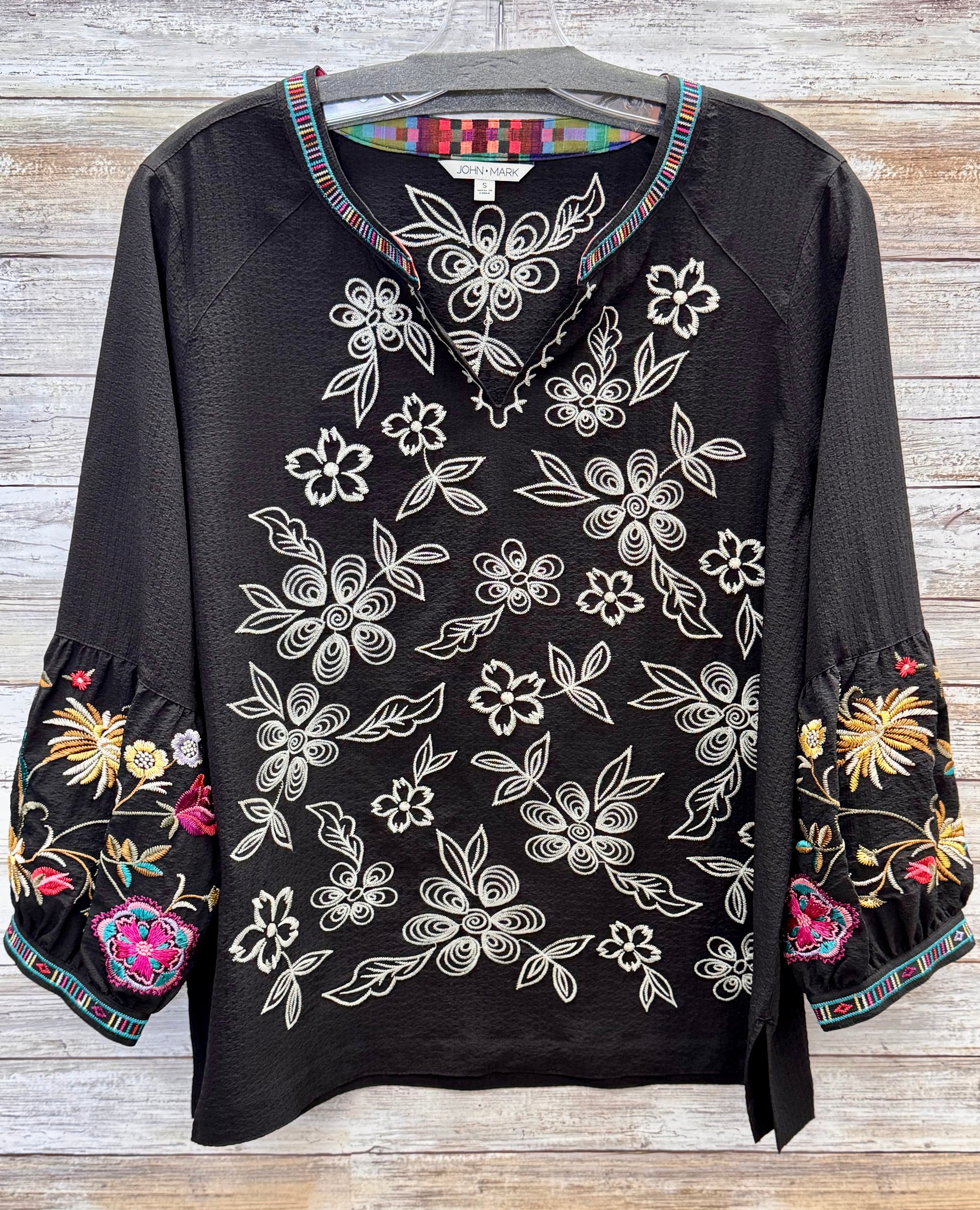 Effortlessly elegant, this embroidered peasant top features a flattering split neckline and three-quarter sleeves that strike the perfect balance between casual and refined. The delicate embroidery adds artisanal charm while the relaxed silhouette ensures all-day comfort. Versatile enough for weekend gatherings or layered under a blazer for polished sophistication.