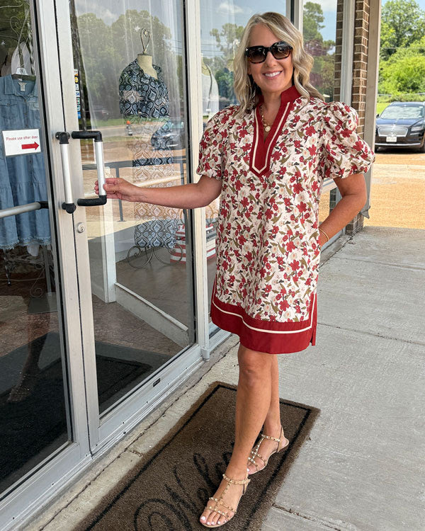 This sophisticated mini dress features a delicate floral print and elbow-length bubble sleeves for a graceful touch. The pullover design is enhanced by a contrasting inset band collar and hem detail, adding refined accents. Made from lightweight woven fabric, it is fully lined and non-sheer, ensuring comfort and elegance. Side pockets provide practical convenience while maintaining the dress’s polished look, perfect for stylish daytime or evening events.