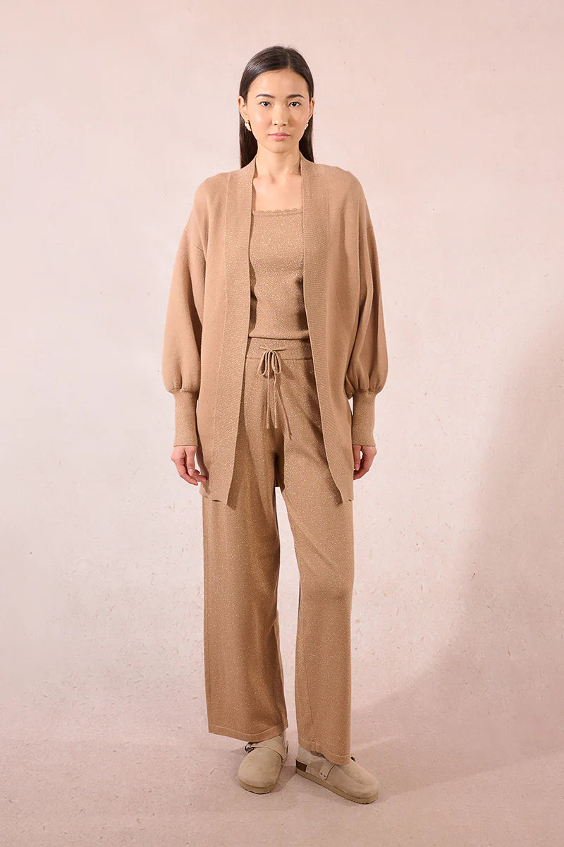 Elevate your wardrobe with this sophisticated Ladies Knitted Set, featuring a long, straight knit cardigan with long sleeves and a flattering V-neckline. The cardigan is adorned with a delicate sequin bow pattern and finished with contrasting buttons and ribbed cuffs and hem for a polished look. Paired with iridescent high-waisted knit pants, complete with an elasticated waist, adjustable tie, and practical side pockets, this set combines comfort with elegance. Designed to flatter, the cardigan measures 22.4 inches from shoulder to hem and the pants have a side length of 40.6 inches in size S.