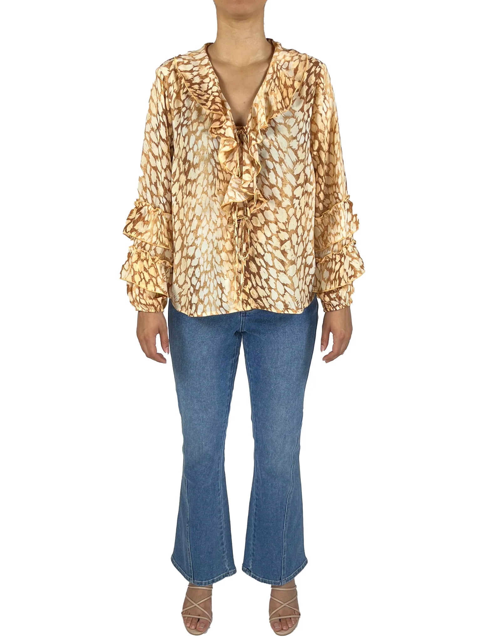 Elevate your wardrobe with this sophisticated Ruffle Print Top featuring a stylish tie front and delicate ruffle sleeves. The subtle animal print detail adds a refined yet playful touch, perfect for making a graceful statement at any occasion.