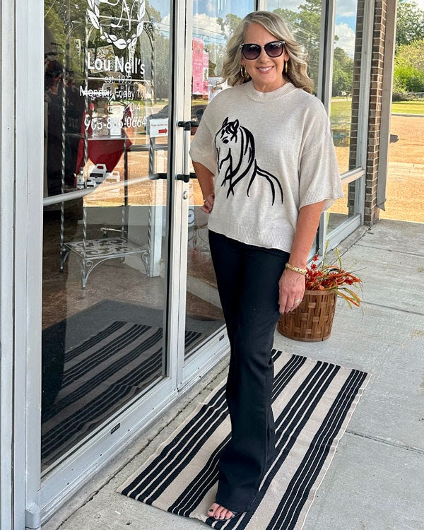This Western Horse Motif Sweater features elegant elbow-length sleeves, blending timeless style with refined comfort. Crafted for those who appreciate subtle equestrian charm, its design offers a polished look ideal for layering or standalone wear, ensuring versatility and grace in any setting.