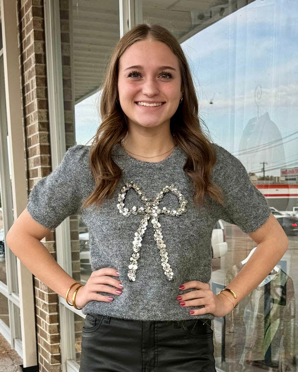 Elevate your everyday wardrobe with this refined knitted sweater, designed for effortless sophistication. Featuring delicate short sleeves with a subtle balloon silhouette and a classic round neckline, this piece strikes the perfect balance between comfort and style. The standout decorative sequin bow adorning the center front adds a touch of understated glamour.
