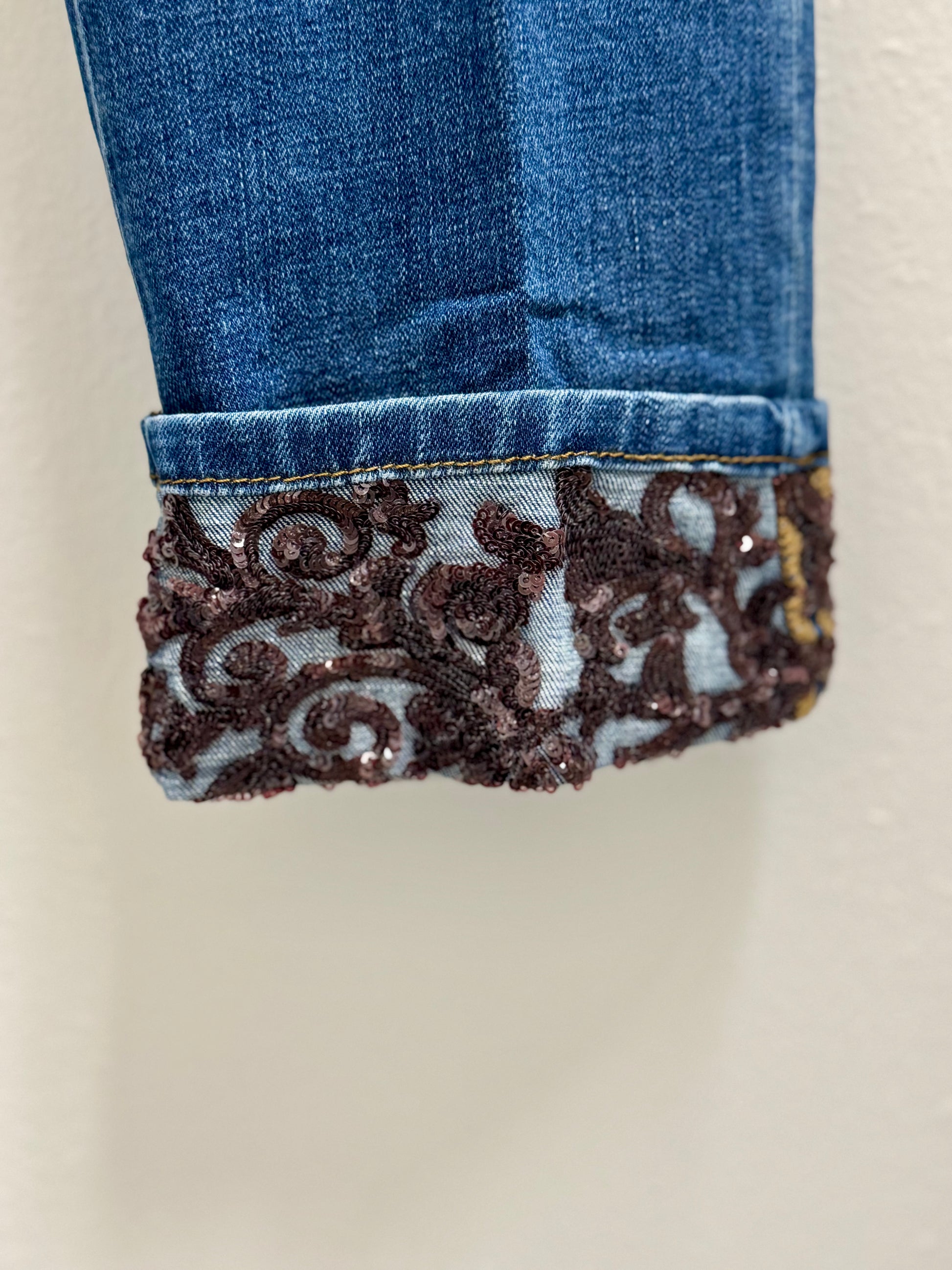 Elevate your style with these zip-front, five-pocket cuffed ankle jeans adorned with subtle sequins. Crafted for a flattering fit, they combine classic denim appeal with a touch of shimmer, perfect for sophisticated casual looks or evening outings. The ankle-length cuff adds a modern edge, making these jeans a versatile and chic wardrobe staple.